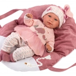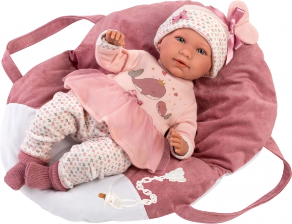 Roztomilé bábätko Llorens NEW BORN s veľkosťou 42 cm má mäkké látkové telo, realistické črty a po stlačení hrudníčka hovorí „mama“, „papa“ a vydáva zvuky plačúceho bábätka. Vďaka kĺbovým končatinám je polohovateľné a vie aj sedieť. Ručne vyrobené v Španielsku, balené v darčekovej krabici.