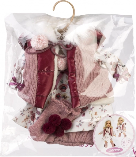 Elegantný 4-dielny oblečok pre bábiky značky Llorens veľkosti 40 cm, ručne vyrobený v Španielsku. Perfektný doplnok pre malé milovníčky bábik.