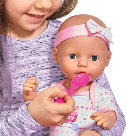 Táto funkčná bábika v roztomilom ružovo‑bielom oblečku je ideálnym spoločníkom na každodenné hranie sa na starostlivosť o bábätko. Deti môžu bábiku kŕmiť, napájať, dať jej cumlík, vymeniť plienku a posadiť ju na nočník. Realistické detaily a pohyblivé viečka podporujú predstavivosť a jemnú motoriku.
