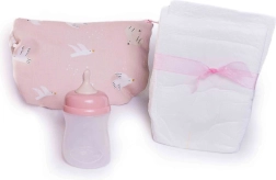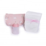 - Bábika, plniteľná fľaštička, 2 jednorazové plienky, darčeková krabica