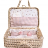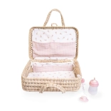 Súčasťou je základná starostlivosť o bábiku – fľaštička, cumlík a jednorazová plienka. Kufrík sa vďaka univerzálnemu dizajnu hodí aj ako piknikový košík. Údržba je jednoduchá: pri zašpinení stačí zotrieť vlhkou handričkou a ihneď osušiť.