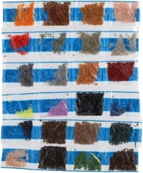 - Plátno s predtlačeným motívom a lepiacou vrstvou, aplikačné pero, miska, vosk, sada farebných kamienkov, legenda symbolov