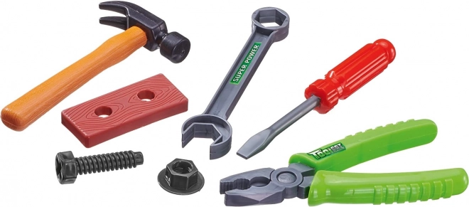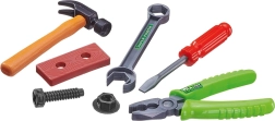 Súčasťou balenia je sada bezpečného plastového náradia (kladivko, kľúč, kliešte, skrutkovač a doplnky), ktorá rozvíja jemnú motoriku a podporuje kreatívnu hru.