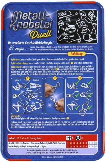 Táto sada SCHMIDT Metall-Knobelei Duell prináša dvanásť šikovne navrhnutých kovových hlavolamov v praktickej plechovej krabičke. Každý kúsok preverí vašu trpezlivosť, logiku a jemnú motoriku: najprv dve časti bez použitia sily oddeľte a potom ich vráťte späť do pôvodného tvaru. Vďaka priloženému ilustrovanému návodu môžete kedykoľvek nahliadnuť pre nápovedu.