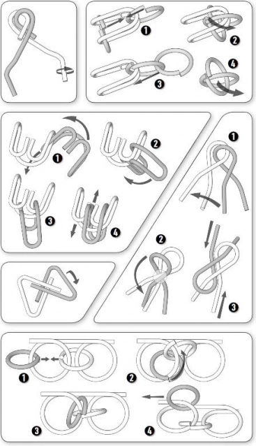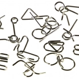 - 12 kovových hlavolamov, plechová krabička, graficky znázornené riešenie