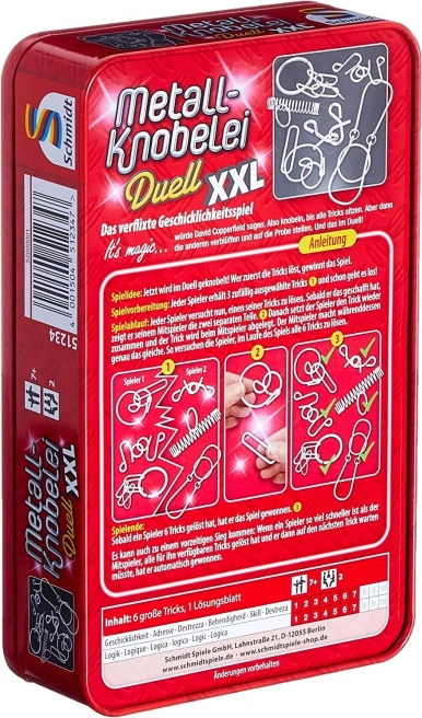 SCHMIDT predstavuje úžasnú sadu kovových hlavolamov Duell XXL, navrhnutú pre milovníkov logických hlavolamov a strategického myslenia. Každý zo šiestich hlavolamov sa skladá z dvoch častí a vašou úlohou je nájsť spôsob, ako ich bez použitia sily od seba oddeliť a potom zložiť späť do pôvodnej podoby. Hlavolamy prichádzajú v štýlovej plechovej škatuľke, ktorá zaručuje ich bezpečné uloženie a jednoduchú prenosnosť.