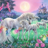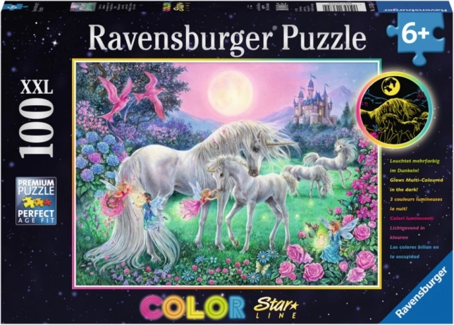 Zábavné a magické svietiace puzzle RAVENSBURGER s motívom jednorožcov pri splne nadchne malých aj väčších staviteľov. Špeciálna fluorescenčná potlač po nasvietení svieti v tme. Vďaka 100 XXL dielikom sa dobre skladá deťom od 6 rokov a rozvíja trpezlivosť aj jemnú motoriku. Rozmer zloženého obrázka cca 49 × 36 cm.